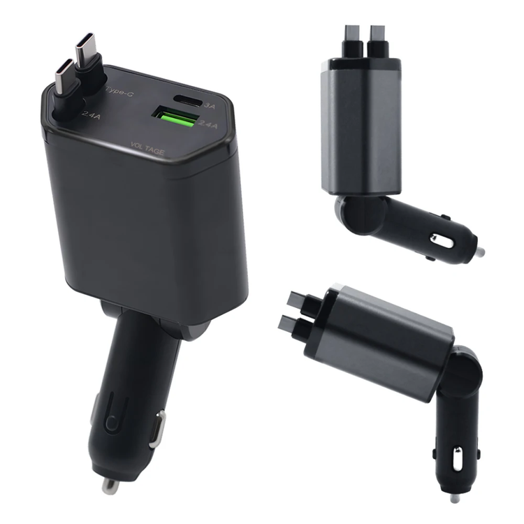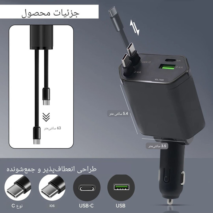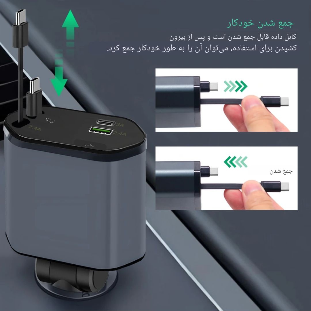 محصولی که به دنبالش بودید، یک شارژر خودروی پیشرفته و کم جا است که با طراحی هوشمندانه اش، شلوغی داخل ماشین را کاملاً از بین میبرد. برخلاف شارژرهای معمولی که کابل هایشان همیشه آویزان و درهم تنیده است، این مدل دارای دو کابل جمع شونده و انعطاف پذیر است که پس از استفاده به راحتی جمع میشوند و داخل بدنه جا میگیرند.